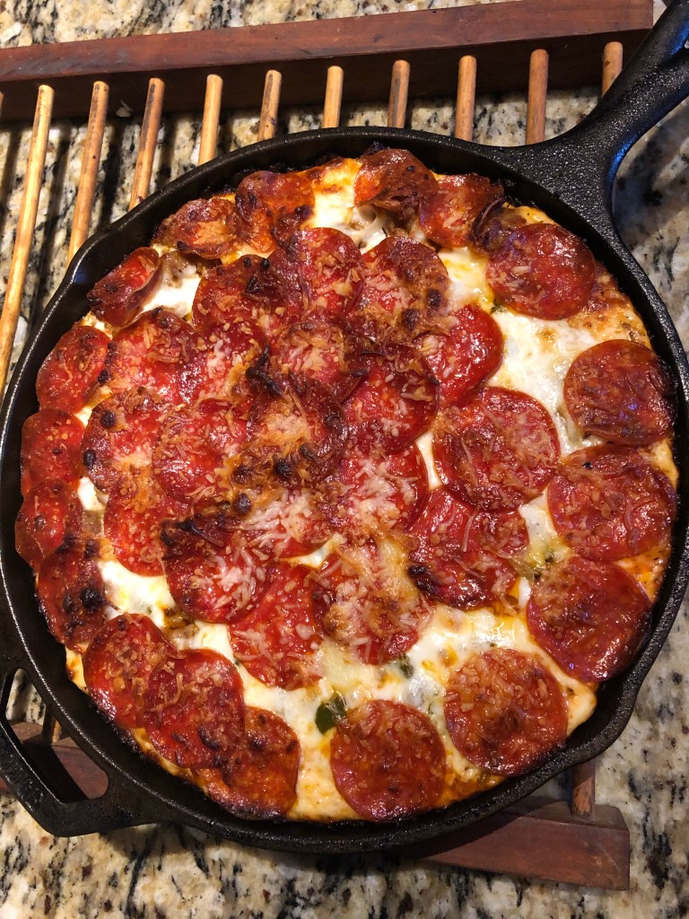 Yesterday, with the sun shining through our kitchen windows, I decided to try a new pizza recipe. I think it turned out pretty well. It’s a pan pizza made in our cast iron skillet. What do you think?